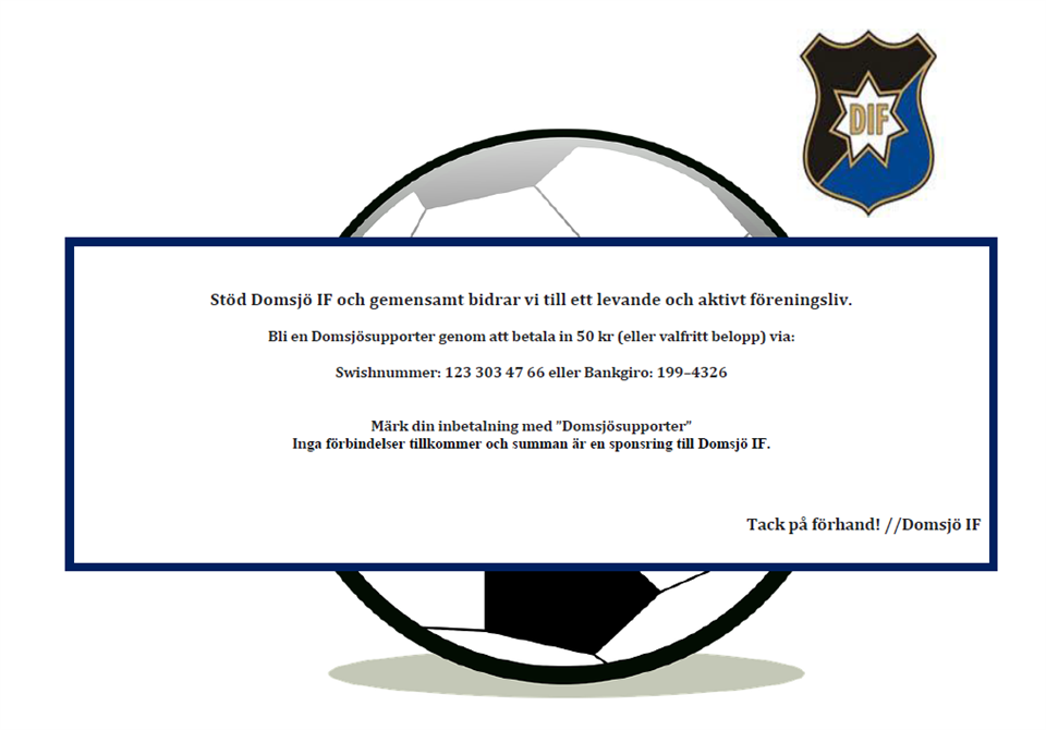 I skrivande stund är världen upp-och-ner. Covid-19 sprids genom landet och även många föreningar och företag drabbas av dess följder. Inom både idrottsvärlden och näringslivet är ovissheten stor, ännu vet ingen hur de ekonomiska konsekvenserna kommer att slå. Men vi är medveten om att som förening står vi inför en av våra största utmaningar någonsin. Gör en hjälteinsats och stöd Din lokala idrottsförening! Bli en Domsjösupporter genom att betala in 50kr (el valfritt belopp) på: Swish: 123 303 47 66 Bankgiro: 199–4326 Märk inbetalningen: ”Domsjösupporter” OBS! Inga förbindelser tillkommer och summan är en sponsring till Domsjö IF. Stöd Domsjö IF och gemensamt bidrar vi till ett levande och aktivt föreningsliv. Tack på förhand! Vänliga Hälsningar, //Domsjö IF